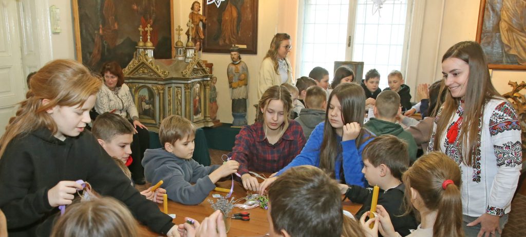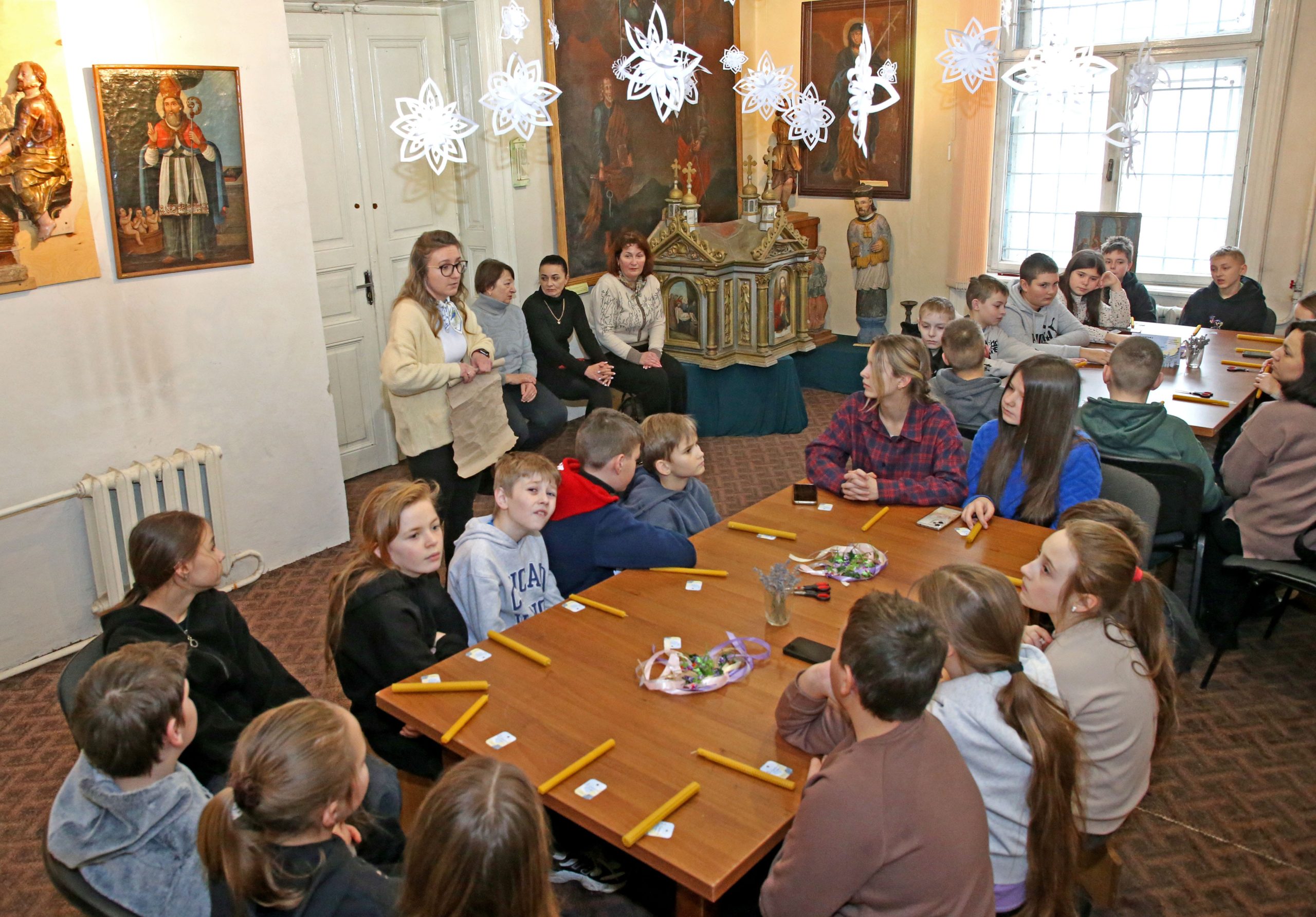 Захід став поєднанням творчої роботи та пізнавальної тематичної екскурсії. Наукова працівниця відділу сакрального мистецтва Марія Гром розповіла про історію, символіку та значення свята Стрітення Господнього, його місце в християнській традиції та народній культурі. Діти оглянули ікону “Стрітення” з церкви Святого Миколая із села Комарники (Турківщина), яка експонується у Галереї, та із зацікавленням слухали цікаві розповіді про іконографічні особливості пам’ятки.